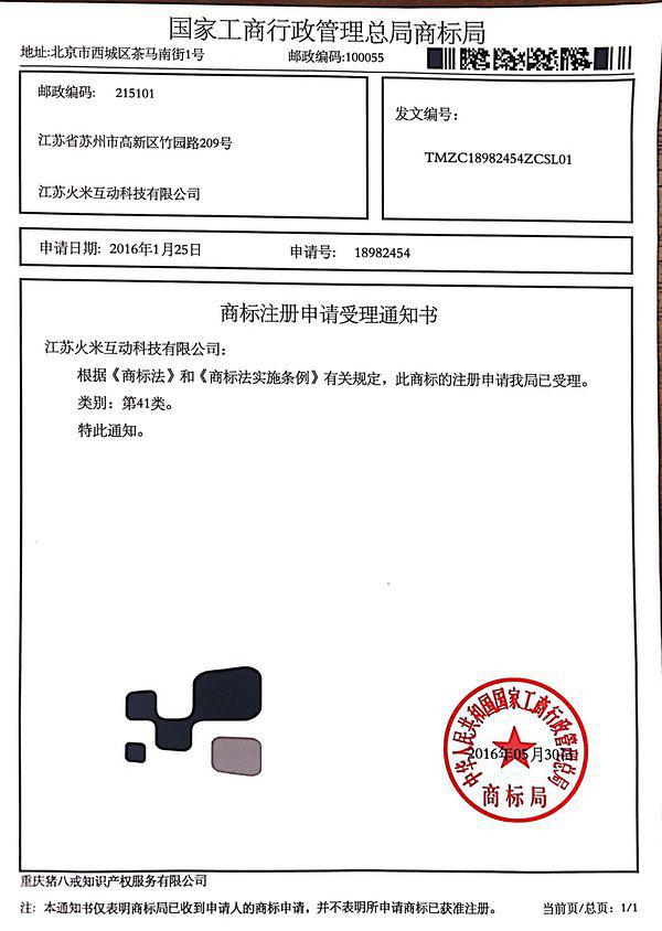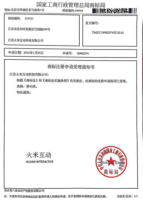 火米互動商標獲得國家行政管理總局商標局理,包含火米互動文字部分和logo部分,標志火米互動啟動品牌化運作邁出了第一步。